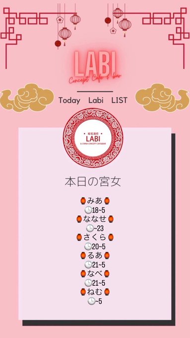 Labi🏮コンカフェ大阪@Labi_osaka·🏮出勤宮女🏮 🏮ねむ@_babu_milk_ 🕒20~1 🏮みあ@miamia85_ 🕒20~3 🏮るあ@Lua_LABI 🕒21~5 🏮さくら@sakura_labi 🕒23~5 今日も一日よろしくぬん🧏 #labi #ラービー #コンカフェ #チャイナ #中華 #コスプレ #大阪コンカフェ #ミナミ23465