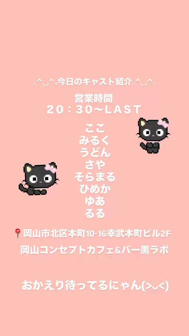 クロラボ^..^ฅ''《岡山コンセプトカフェ&バー》@KOkayama6437·ご主人様、お嬢様今日も一日お疲れ様です! 今日は、中央町のAliceと094、3店舗合同営業にゃん♡♡ 推しキャストさんがいつもと違う衣装かも‼️ おかえり待ってます❣️ #岡山 #コンカフェ #コンセプトカフェ #コンセプトバー21270