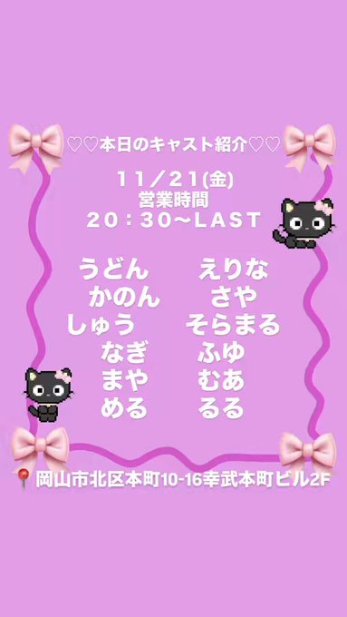 クロラボ^..^ฅ''《岡山コンセプトカフェ&バー》@KOkayama6437·8時間推しキャストさんがもしかしたらいつもと違う衣装かも・・・‼️引用クロラボ^..^ฅ''《岡山コンセプトカフェ&バー》@KOkayama6437·12時間明日11/22はニャンと!!🐈⬛🎀 黒ラボ、Alice、0943店舗合同営業デス‼️ 月に1回しかないイベント(>ᴗ