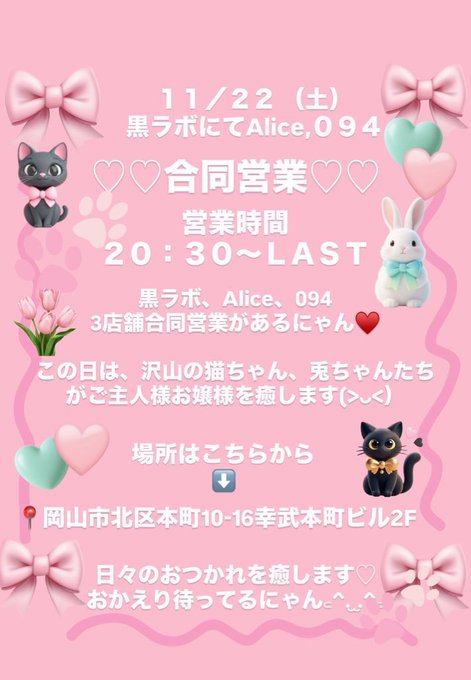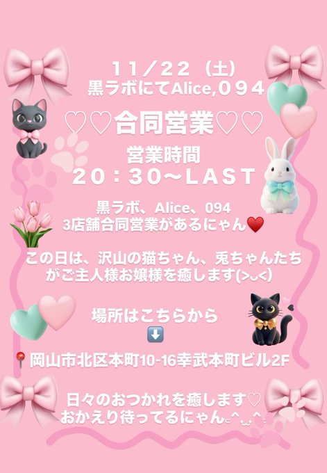 クロラボ^..^ฅ''《岡山コンセプトカフェ&バー》@KOkayama6437·今日は11/22(ニャンニャンの日)! そして黒ラボ、Alice、094の3店舗合同営業です(>ᴗ