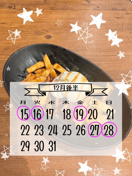 固定ニカ🌷@追憶のエクリプス@nika_tsuieku·12月後半です! 課外授業のレポートに追われているので少ないです、、スミマセン 15.16.27.28 18:00-23:00 19 18:30-23:005130