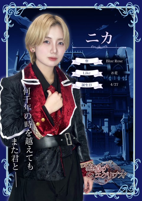 ニカ🌷@追憶のエクリプスさんがリポスト追憶のエクリプス🦇12/15OPEN大阪男装コンカフェ@tsuioku_eclipse·˚˙༓࿇༓˙˚˙༓࿇༓˙˚˙ 📕Vamp紹介🦇 ˚˙༓࿇༓˙˚˙༓࿇༓˙˚˙ ニカ @nika_tsuieku Blue Rose クールで冷静沈着 冷たく見えるが寄り添う姿勢 #男装コンカフェ #エクリプス学院12158