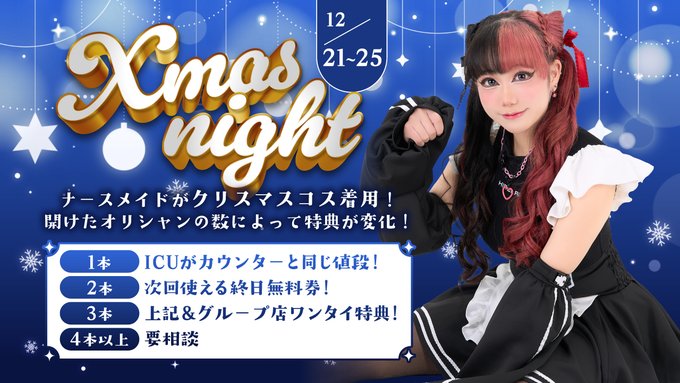 NEO:ALCOHOLIC🧬秋葉原コンカフェ@NEO_ALCOHOLIC·⋆。°✩₊˚.⋆ ⋆.˚₊✩°。⋆⋆。°✩₊˚. Xmas night ⋆。°✩₊˚.⋆ ⋆.˚₊✩°。⋆⋆。°✩₊˚. 12/21~12/25 ナースメイドがクリスマスコス着用🎄 開けたオリシャンの数によって特典が変化㊙️91