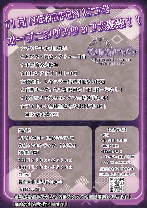 【新店】バスカヴィルラウンジ 歌舞伎町コンカフェ@BL_concafe·🌙オープニングスタッフ募集中🌙 2025年11月、歌舞伎町に新しいコンカフェがオープン☕️ ✨可愛い制服で働いてみたい✨ ✨オープニングに関わりたい✨ 1から一緒にお店を盛り上げてみませんか??🥰 お友達との応募も大歓迎💜 少しでも気になったらDM、LINEからお気軽にお問い合わせください!さらに表示5195
