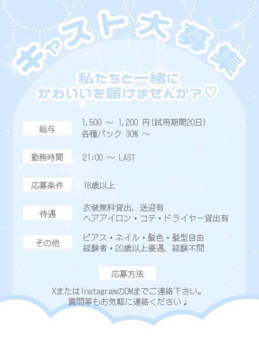 ばにーてーる@bunnytail_0814·広島流川のコンカフェで働きたい人いませんか? お悩み聞いて働きやすい環境づくを目指してます!! 大学生もしくは、社会人の女性やフリーターも大歓迎♩ 今、入店お祝い金&面接交通費を出してます。 ※勤務時間は、19時〜も可能です。 #コンカフェ #コンカフェ求人 #自撮り界隈 #求人さらに表示463,107