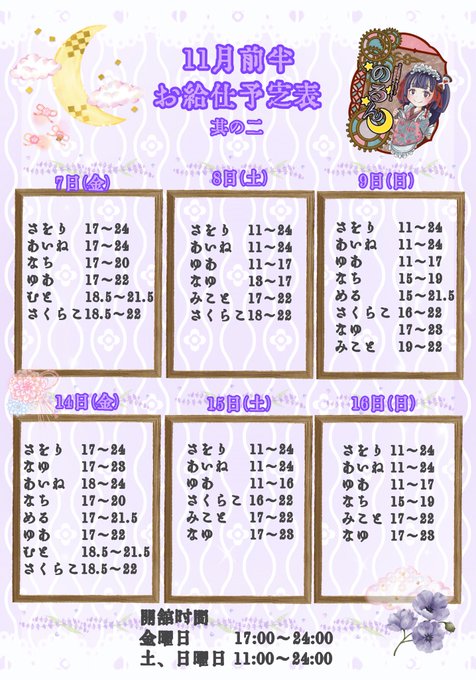 藤宮さをり💜喫茶のるん@norn_sawori·11月5日全体お給仕予定お待たせしました! これは公式w わたしはだいたいいますが、休憩いただいたり中抜けすることがありますのでその際はおしらせします(⋆ᴗ͈ˬᴗ͈)”引用のるん🫖岡山コンカフェ@norn_okayama·11月5日🫧🫖のるん女給のお給仕予定表☕️ お食事メニューのお報せは前日〜当日朝までお待ちくださいませ。 初お給仕の新人女給もおりますため、温かい目で優しく見守ってくだされば幸いです。なにかあればプロデューサーまでお伝えください。 客人様方のご来館を心よりお待ちしております(⋆ᴗ͈ˬᴗ͈)”1141,134