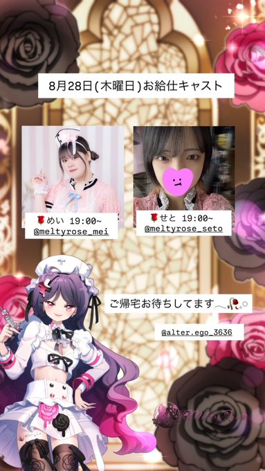 京都コンセプトバーMeltyRose🥀💉@MeltyRose___·(月曜日)のお給仕です🌹 🌹めい 19:00~ 🌹ここ 19:00~ ご帰宅お待ちしてます𓂃🥀𓈒𓏸 @AlterEgo_3636 もお給仕いたします61611