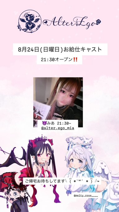 京都コンセプトカフェ&バーAlterEgo👼🏻@AlterEgo_3636·8月24日誠に勝手ながら本日は臨時休業させていただきます。 MeltyRoseは通常通り営業してますのでご帰宅お待ちしてます𓂃🥀𓈒𓏸引用京都コンセプトカフェ&バーAlterEgo👼🏻@AlterEgo_3636·8月24日8月24日(日曜日)のお給仕です😈👼 😈みあ 21:30~ ご帰宅お待ちしてます𓆩 (⃔ *`꒳´ * )⃕ 𓆪↝ @MeltyRose___ もお給仕いたします💉🥀263
