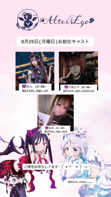 京都コンセプトカフェ&バーAlterEgo👼🏻@AlterEgo_3636·(月曜日)のお給仕です😈👼 😈おん 19:00~ 😈ぴあにか 20:00~ 😈みあ 21:30~ ご帰宅お待ちしてます𓆩 (⃔ *`꒳´ * )⃕ 𓆪↝ @MeltyRose___ もお給仕いたします💉🥀11300