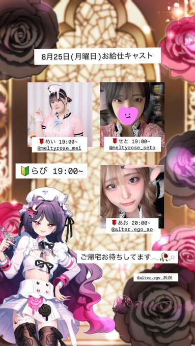 京都コンセプトカフェ&バーAlterEgo👼🏻さんがリポスト京都コンセプトバーMeltyRose🥀💉@MeltyRose___·(月曜日)のお給仕です🌹 🌹めい 19:00~ 🌹せと 19:00~ 🔰らび 19:00~ 🌹あお 20:00~ ご帰宅お待ちしてます𓂃🥀𓈒𓏸 @AlterEgo_3636 もお給仕いたします👼😈11363