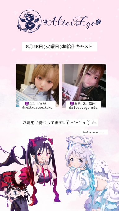 京都コンセプトカフェ&バーAlterEgo👼🏻@AlterEgo_3636·(日曜日)のお給仕です😈👼 😈ここ 19:00~ 🔰まひろ 19:00~ 😈しゃけ 21:00~ 😈みあ 21:30~ ご帰宅お待ちしてます𓆩 (⃔ *`꒳´ * )⃕ 𓆪↝ @MeltyRose___ もお給仕いたします💉🥀1021,360