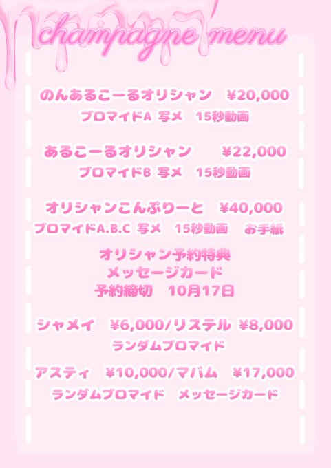 あ・ざらしひめ♡10/25生誕祭♡@nemunemunyanaza·10月17日予約今日までです😭😭😭よやくを、ください、😭😭😭引用くりーむ♡@pome_098·10月13日【10月26日 ❤︎15:00〜23:00開催】 とど・あざらし・ねこの 🎀NEXT STAGE🎀を記念したメニューになります✨ 【オリシャン予約】 ご予約は 10月17日(木) までとなります🍾✨ぜひお早めにご予約ください💖 ⚠️高額シャンパンは要予約です⚠️ ぜひ3人の新しいスタートをお祝いしてください🤍72,388