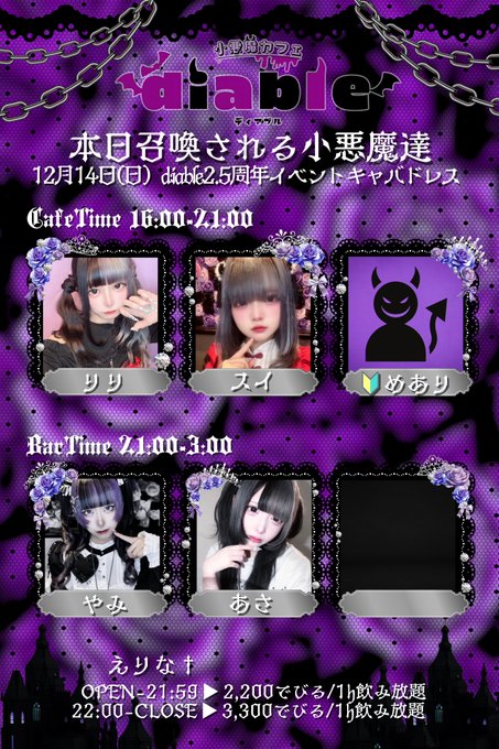 小悪魔カフェ diable 😈福岡天神 コンカフェ ディアブル@diable0610·12/14(日)16:00-5:00 😈本日召喚される小悪魔たち😈 🎉diable2.5周年イベント🎉 衣装 CAFE 16-21 りり@riri_diable スイ@sui_diable 🔰めあり@mary_diable BAR 21-3 やみ@ymrm_01 あさ@yoru_hgh @Erina_diable ✝️お問い合わせ応募 http://lin.ee/yi0glA141251