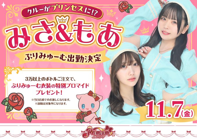 🎀Primium(ぷりみゅーむ)🎀上野コンカフェ@Primium_cafe·/ 11月7日(金) クルーがプリンセスに⁉️ ︎︎☁みさ @pfc__misa ︎︎☁もあ @pfc_moa ぷりみゅーむ出勤決定🌹 \ Premiumグループ初✨ Premium First Classのみさ&もあがぷりみゅーむに出勤します🌟 3万ローズ以上のボトルご注文で、ぷりみゅーむ衣装の特別ブロマイドプレゼント🎁さらに表示321,188