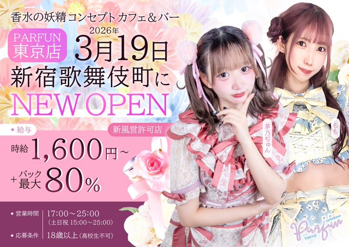 パルファン歌舞伎町🧚♀️新宿歌舞伎町コンカフェ@parfun_tokyo·💐2026年3月19日新宿 歌舞伎町NEW OPEN💐 🩵全国展開最大級コンカフェグループ プロデュース店🩵 💴時給1,600円〜 💰祝金35,000円 ⭐日払いOK 👗オリジナル全10種類ご用意! 💐寮&送り完備 未経験の 方大歓迎.。ෆ 【ご応募はこちらから】 http://lit.link/parfun_tokyo69