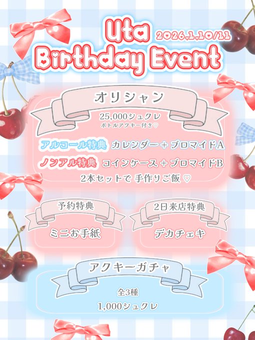 melffy めるふぃー 岡山コンカフェ@melffy_cafe·【生誕告知】 💎うた生誕祭🍒 2026年1月10日(土),11日 (日) オリシャン、高額シャンパン共に事前予約は【12月26日】締切です! うたのDMまたはmelffy公式DMまでお願いします⭐️うたちま🧶🆗1/10,11生誕671,762