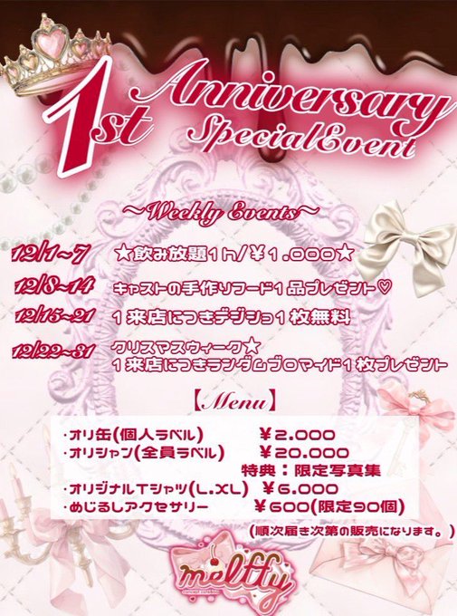 melffy めるふぃー 岡山コンカフェ@melffy_cafe·🌟12月12日(金)のおひめさま🌟 【melffy1周年イベント🍰🩷】 キャストの手作りフード一品プレゼント🍴 18時-𝗼𝗽𝗲𝗻 りさ@melffy_risa ななせ@melffy_nanase 〜22時 うた@melffy_uta 20時~ Ren @melffy_ren 20時~ みなさまのご帰宅お待ちしております🎀22181