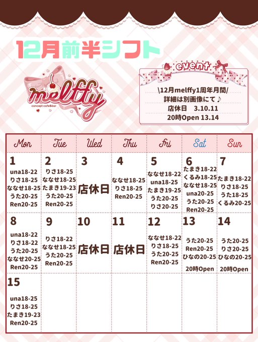固定melffy めるふぃー 岡山コンカフェ@melffy_cafe·12月前半シフト ✼••┈┈••✼••┈┈••✼••┈┈••✼••┈┈••✼ 🧸店休日:3.10.11 🧸12月melffy1周年月間開催❕ よろしくお願いいたします🌟141,175
