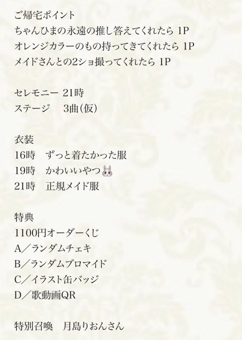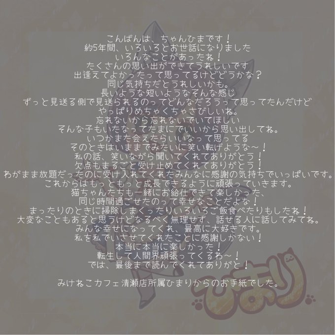 ひまり@みけねこカフェ清瀬@himarimikeneko·33分まじごめんなんだけど変更あります❕ 16時 18時 21時で衣装替えです❕❕❕引用ツイートひまり@みけねこカフェ清瀬@himarimikeneko·2月12日こんなかんじ❕ 最後の最後まで思い出作ろうナ❕ 来れそうだったら会お❕ 特別召喚もしっかりちぇっく❕たのむ❕🫶2