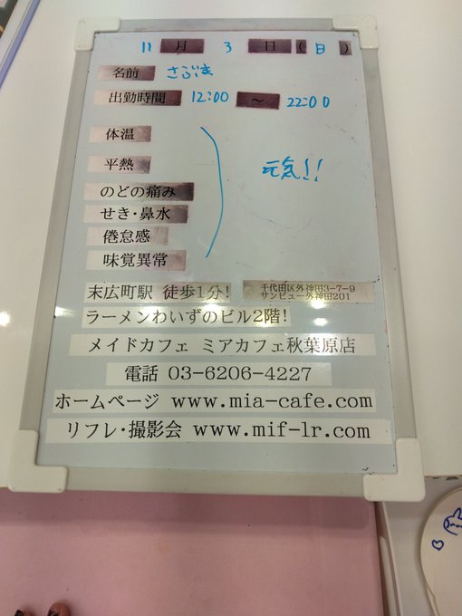 【公式】 秋葉原メイドカフェ ミアカフェ秋葉原店 🌸 メイドリフレ 撮影会 ミアリラ&フォト東京店@mia_group·👑本日11月3日(月)の総合案内👑 🎀ミアカフェ秋葉原店🎀 🎃本日12:00〜22:00オープン🎃 🎀ミアカフェ山梨店🎀 🎃本日18:00〜22:00オープン🎃 🎀ミアカフェ浜松店🎀 おやすみ→次回営業は11/5(水)、7(金)、8(土)予定 🎀ミアカフェ静岡店🎀 おやすみ→次回営業は11/8(土)、9(日)予定 #メイドカフェ34164