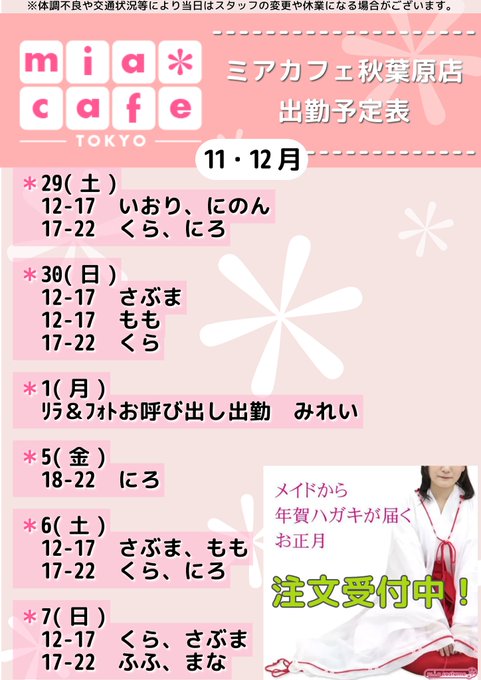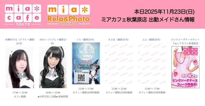 【公式】 秋葉原メイドカフェ ミアカフェ秋葉原店 🌸 メイドリフレ 撮影会 ミアリラ&フォト東京店@mia_group·★#メイドカフェ ・ミアカフェ #秋葉原 店★ ☕️営業予定日☕️ 🎀11月29日(土) 12-17 いおり,にのん【あの元ダブル店長ズ出勤!✨】 17-22 くら,にろ 🎀11月30日(日) 12-22 さぶま 12-17 もも 17-22 くら 🎀12月5日(金) 18-22 にろ 🎍#年賀状 →https://miacos.jp/?pid=187708237 #コンカフェ2198