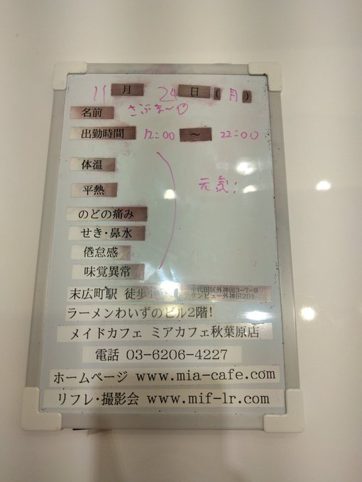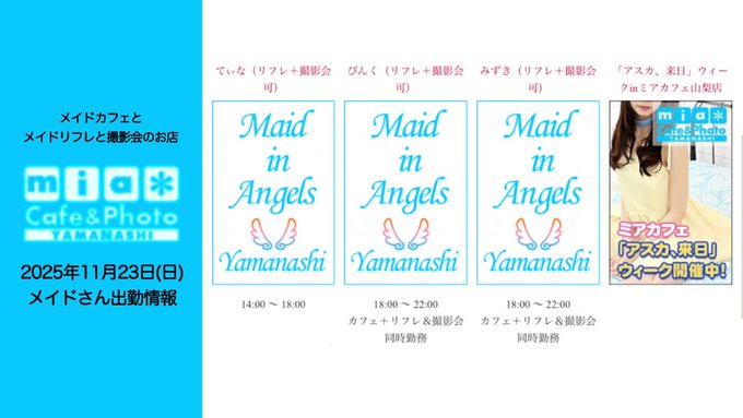 【公式】 秋葉原メイドカフェ ミアカフェ秋葉原店 🌸 メイドリフレ 撮影会 ミアリラ&フォト東京店@mia_group·👑本日11月26日(水)の総合案内👑 🎀ミアカフェ秋葉原店🎀 おやすみ→次回11/29(土)、30(日) 🎀ミアカフェ山梨店🎀 おやすみ→次回11/29(土)、30(日) 🎀ミアカフェ浜松店🎀 🍀本日18:00〜22:00オープン🍀 🎀ミアカフェ静岡店🎀 おやすみ→次回11/29(土) #メイドカフェ3438