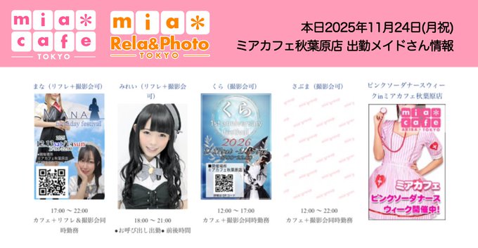 【公式】 秋葉原メイドカフェ ミアカフェ秋葉原店 🌸 メイドリフレ 撮影会 ミアリラ&フォト東京店@mia_group·👑本日11月24日(月祝)総合案内👑 🎀ミアカフェ秋葉原店🎀 🍀12:00〜22:00営業🍀 🩷ピンクナースイベ 🎀ミアカフェ山梨店🎀 🍀18:00〜22:00営業🍀 💛アスカイベ 🎀ミアカフェ浜松店🎀 おやすみ→次回11/26(水)、29(土) 🎀ミアカフェ静岡店🎀 おやすみ→次回11/29(土) #メイドカフェ33153