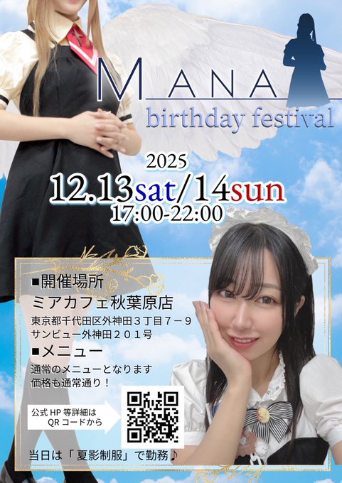 【公式】 秋葉原メイドカフェ ミアカフェ秋葉原店 🌸 メイドリフレ 撮影会 ミアリラ&フォト東京店さんがリポストまな 秋葉原 メイドカフェ ミアカフェ秋葉原店 + 撮影会&メイドリフレ ミアリラ&フォト東京店@miamaid14·まなです🐰 今週末は土日両方ミアにいます! 🤍12月13日(土)17:00〜22:00 🤍12月14日(日)17:00〜22:00 両日とも、まな生誕祭イベントです✨ いつもと違う衣装でお給仕するので 見にきてもらえたら嬉しいです🪽 会えるの楽しみにしてるからねー!! お待ちしていますっ🪄⊹˚₊317163