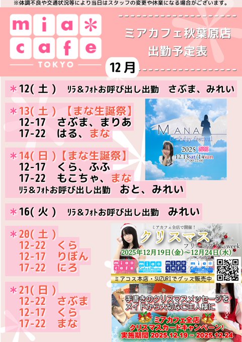 【公式】 秋葉原メイドカフェ ミアカフェ秋葉原店 🌸 メイドリフレ 撮影会 ミアリラ&フォト東京店@mia_group·🎍#年賀状📮https://miacos.jp/?pid=187708237 ★#メイドカフェ ・ミアカフェ #秋葉原 店★ ☕️営業予定日☕️ 🎀12月12日(金) リラ&フォトお呼び出し出勤 さぶま、みれい 🎀12月13日(土) 12-17 さぶま,まりあ 17-22 🎂まな,はる 🎀12月14日(日) 12-17 くら,ふふ 17-22 🎂まな,もこちゃ #生誕祭1186
