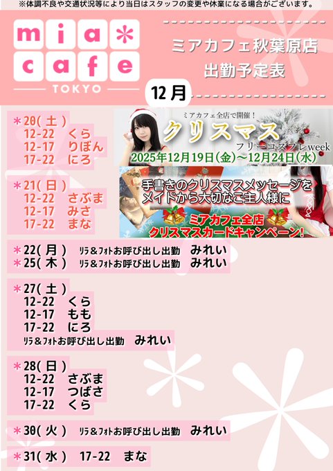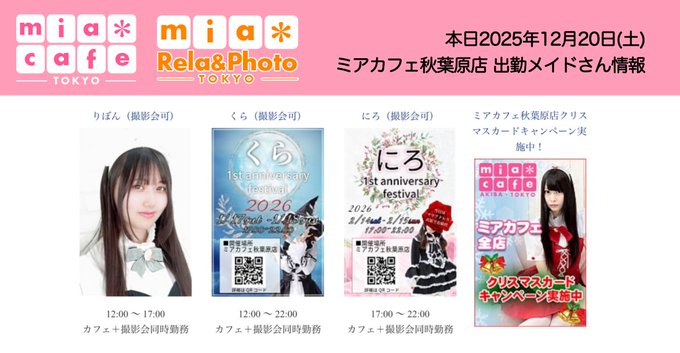 【公式】 秋葉原メイドカフェ ミアカフェ秋葉原店 🌸 メイドリフレ 撮影会 ミアリラ&フォト東京店@mia_group·★メイドカフェ・ミアカフェ #秋葉原 店★ ☕️営業予定日☕️ 🎁12月20日(土)🎅 12-22 くら 12-17 りぼん 17-22 にろ 🎁12月21日(日)🎅 12-22 さぶま 12-17 みさ 17-22 まな 🎀12月22日(月) リラ&フォトお呼び出し出勤 みれい 🎀12月25日(木) リラ&フォトお呼び出し出勤 みれい62