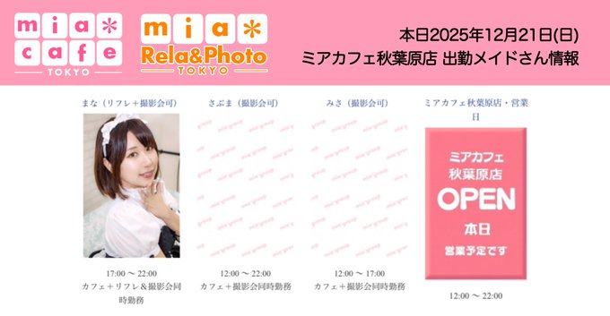 【公式】 秋葉原メイドカフェ ミアカフェ秋葉原店 🌸 メイドリフレ 撮影会 ミアリラ&フォト東京店@mia_group·👑本日12月21日(日)の総合案内👑 🎀ミアカフェ秋葉原店🎀 🎄本日12:00〜22:00オープン🎄 🎀ミアカフェ山梨店🎀 🎄本日14:00〜18:00オープン🎄 🎀ミアカフェ浜松店🎀 🎄本日17:00〜21:00オープン🎄 🎀ミアカフェ静岡店🎀 🎄本日17:00〜21:00オープン🎄 #メイドカフェ34145