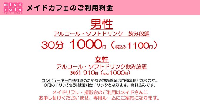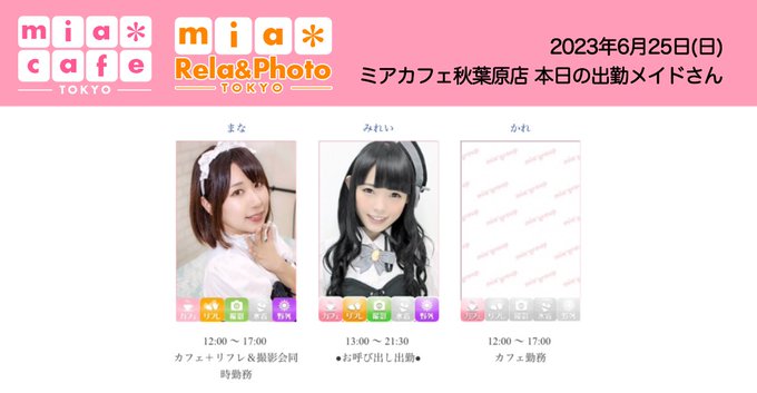 【公式】 秋葉原メイドカフェ ミアカフェ秋葉原店 🌸 メイドリフレ 撮影会 ミアリラ&フォト東京店@mia_group·本日6月25日(日)の営業情報 ☆*:.。.。. 🩷ミアカフェ秋葉原店🩷 オープンしました!!! 12:00〜17:00営業 まな、新人かれ 出勤! ☆*:.。.。. 🧡ミアリラ&フォト秋葉原店🧡 みれい 出勤 ご予約で満席です ☆*:.。.。. #メイドカフェ #メイドリフレ #撮影会1