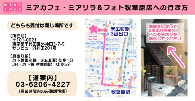 【公式】 秋葉原メイドカフェ ミアカフェ秋葉原店 🌸 メイドリフレ 撮影会 ミアリラ&フォト東京店@mia_group·返信先: @mia_groupさん/ ミアカフェもミアリラも 受付場所は同じです! ご帰宅お待ちしてます♡ \ ■場所 末広町駅徒歩1分/秋葉原駅7分 〒101-0021 東京都千代田区外神田3-7-9 サンビュー外神田201 ■道案内・ご予約はこちら 03-6206-4227 #メイドカフェ #メイドリフレ #撮影会