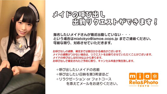 【公式】 秋葉原メイドカフェ ミアカフェ秋葉原店 🌸 メイドリフレ 撮影会 ミアリラ&フォト東京店@mia_group·本日6月22日(木)の ミアリラ&フォト東京店は ☆*:.。.。.:*☆*:.。.。.:*☆ メイド不在のため 本日おやすみ致します ☆*:.。.。.:*☆*:.。.。.:*☆ 指名したいメイドさんが 出勤してないという時は 『メイドの呼び出しリクエスト』 ができます! お気軽にメールください 💌miatokyo@lamoe.oops.jp