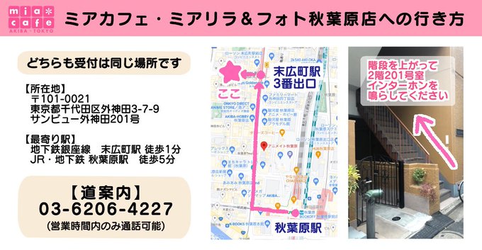 【公式】 秋葉原メイドカフェ ミアカフェ秋葉原店 🌸 メイドリフレ 撮影会 ミアリラ&フォト東京店@mia_group·本日7月1日(土) ミアリラ&フォト東京店 ☆*:.。.:* みれい 出勤! ご予約で満席です🙇♂️ *:.。.:*☆ #メイドリフレ と スタジオ代込みの #撮影会 のお店 ■場所 末広町駅徒歩1分/秋葉原駅7分 〒101-0021 東京都千代田区外神田3-7-9 サンビュー外神田201 ■道案内 03-6206-42271