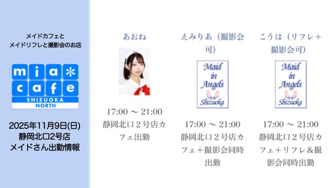 【公式】 静岡メイドカフェ ミアカフェ静岡北口2号店 メイドリフレ 撮影 ミアリラ&フォト静岡北口店@shizuokamaidsan·★#メイドカフェ ・ #ミアカフェ #静岡 北口2号店★ ☕️営業予定日☕️ 💖11月15日(土) 17-21 みちゃ 💖11月16日(日) 17-21 あおね・えみりあ・こうは 🚨ポリスイベント🚨 🚨11月22日(土) 17-21 ましろ・みちゃ 🚨11月23日(日) 17-21 あおね・みちゃ 💖11月29日(土) 17-21 みちゃ #コンカフェ1171
