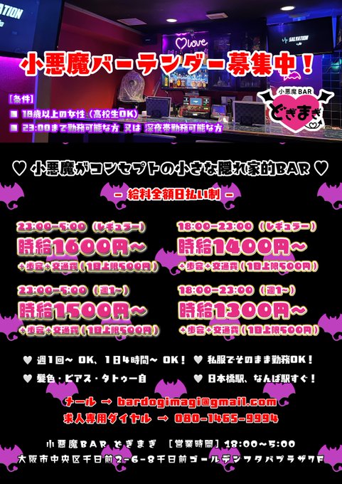 小悪魔BAR どぎまぎ@bardogimagi·◆◇◆ キャスト募集中 ◆◇◆ 大阪 裏難波にあるコンカフェ♪ 求人募集中です★ かわいい小悪魔ちゃんと一緒にお給仕しませんか?😈 ◆給料全額日払い可能 ◆服装自由!(私服でそのまま勤務可能) ◆難波駅・日本橋駅すぐの好立地 ◆高時給・高歩合率(ドリンクバック30%以上) 詳細は画像↓2199,118