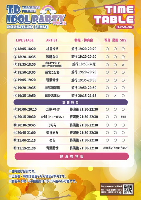 ひめ🦀❤️LIVE♡11/17.20.26 12/16.18.30@hime_monoclub·【ライブ出演のお知らせ】 『TD IDOL PARTY VOL.16』 日程 2025年11月20日(木) 時間 open17:55〜/start18:05〜 (出番20:15〜20:30/物販21:30〜22:30) 場所 FairyTalesOsaka 料金 推しチケット 2,900円+1D 通常チケット 2,400円+1D (DD予約+500円)218485