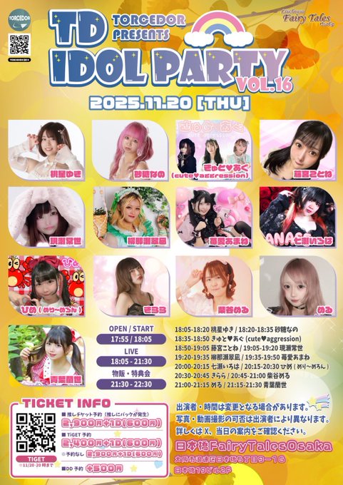 ひめ🦀❤️LIVE♡11/17.20.26 12/16.18.30@hime_monoclub·9時間こちらのライブに出演させていただきます💁♀️✨ この日もソロでの出演になります🦀❤️ そして、この日も推しチケットがあります🎀 ひめを見に来たよ!ひめの応援に来たよ!ってそのお気持ちがとても嬉しいので強制ではないですがよろしければよろしくお願いします🙇♀️ mono CLUBからも近い会場なので是非🎶引用ひめ🦀❤️LIVE♡11/17.20.26 12/16.18.30@hime_monoclub·9時間【ライブ出演のお知らせ】 『TD IDOL PARTY VOL.16』 日程 2025年11月20日(木) 時間 open17:55〜/start18:05〜 (出番20:15〜20:30/物販21:30〜22:30) 場所 FairyTalesOsaka 料金 推しチケット 2,900円+1D 通常チケット 2,400円+1D (DD予約+500円)18288