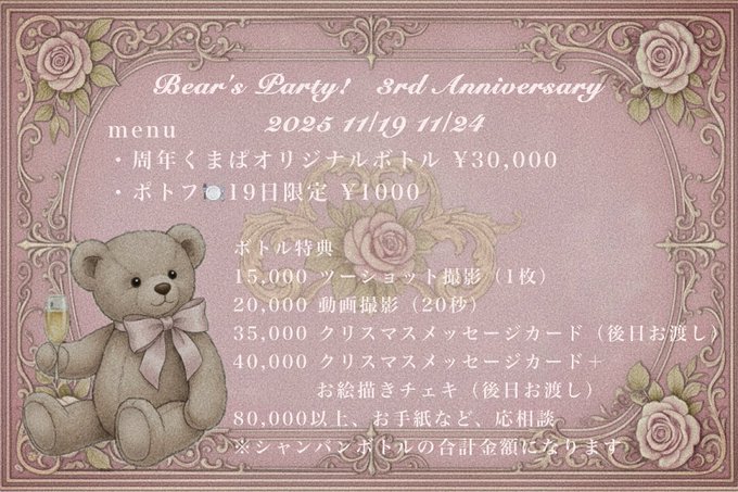 ひよさんがリポストBear's Party!@kumapa___·──── . ₊ ݁⟡ ୨ৎ ⟡ ݁₊ . ──── 🧸Bear's Party! 3周年EV🎂 11/19、11/24 ──── . ₊ ݁⟡ ୨ৎ ⟡ ݁₊ . ──── 3周年です❕これからも楽しく過ごしていただけるようにべあちゃん一同さらなる成長を目指して励んでまいります🍽️ たくさんのご帰宅をお待ちしております🎶415707