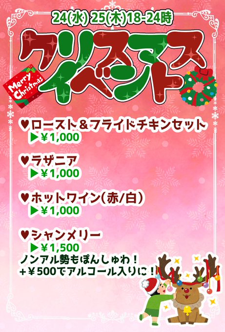 メイド&サブカル カフェバー ぷるきゅー@purukyu·本日もご来店ありがとうございました💓 明日12/23(火)はお休みですが 翌々日の12/24(水)は🎄X'masイベント1日目🎄🎉 出勤キャストはクリスマスコスプレでお出迎え🤶💕 イベントメニュー🍸🍴はもちろん、X'masチキン🍗やシャンメリー🍾もご用意しています🎶 出勤情報はリプ欄をご参照下さい💞さらに表示11169
