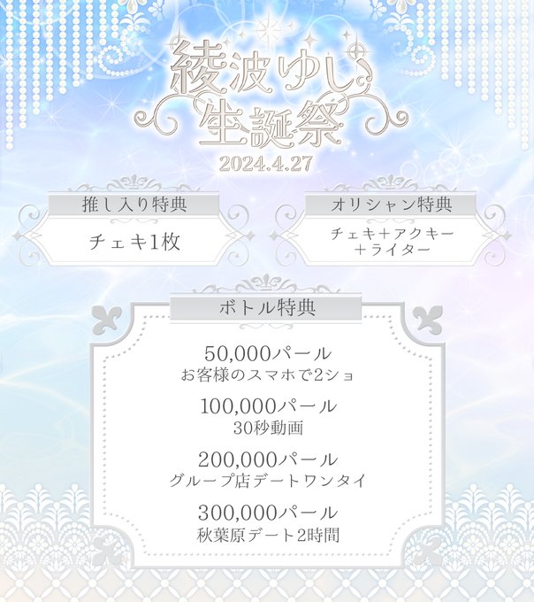 えりな@mermaid_erina_·ほんじつこちらദ്ദിᐢ- ̫-ᐢ₎引用Mermaid(マーメイド)秋葉原🧜♀️コンカフェ🌊@mermaid_bar·4月26日┊✧✧✧04.27✧✧✧┊ ꒰ঌ 綾波 ゆい 生誕祭 ໒꒱ 🤍あやなみちゃんの BDイベントを開催します🤍 一年に一度の特別な日🎉 あやなみちゃんの王子様&お姫様 深海で一緒にお祝いしましょう🎂 豪華特典は画像をチェック☑