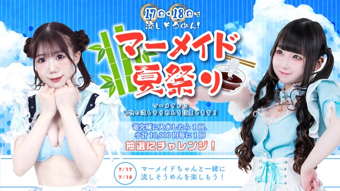 楽しそう😂 【予告】 7/17~7/23 ◤ ◥ 🎆Mermaid夏祭り🎆 ◣ ◢ 暑い夏はマーメイドで夏祭り🌟 17・18日は流しそうめんができちゃう‼ 竜宮城に入水 or 小計10,000円以上につき 1回抽選にチャレンジ✨ #秋葉原 #コンカフェ