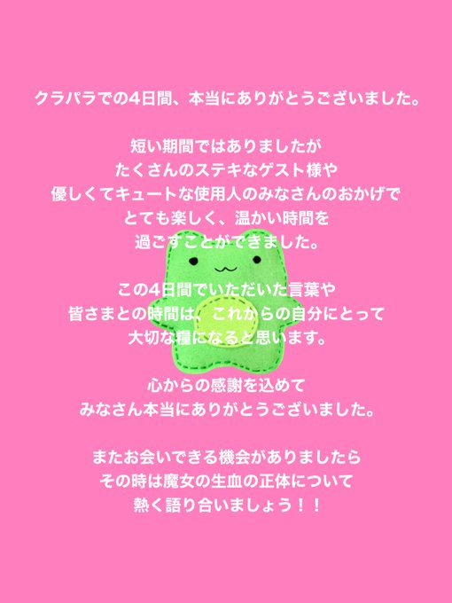 フォス⋆꙳@クロナイ@kuronai_phos·ログアウトでちた!!! 今日ハおっき赤マントサント最後写真とてきた!( -`ω-)b 今日ハ沢山ノ契約者様ガ居テリメイク版の地獄銭湯はじめテ見テめちゃ面白かっタ!!またお家でモもう1回ゆっくり見ル!!👍👍 初めましてナ契約者様モいっぱい居テお話してくれテ嬉しかったナ!💗💗 また明日タ!12245