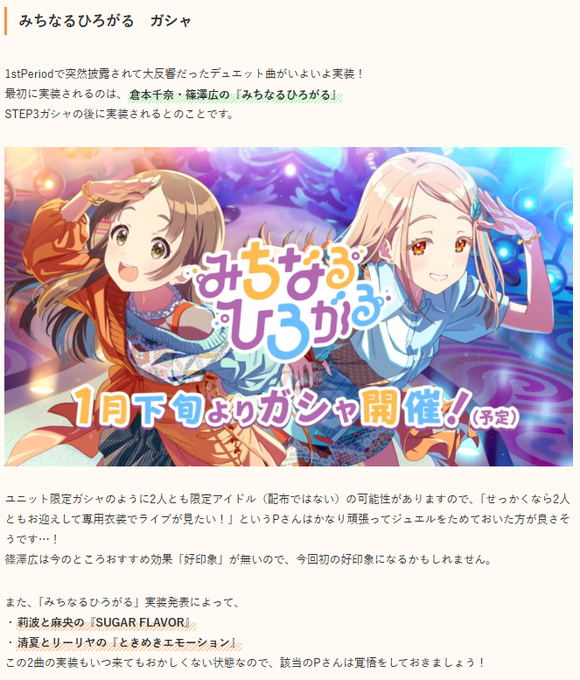 ゆにゃ🍓monoCLUB モノクラブ@yunya_monoclub·1月10日ぺろりん歓喜引用学園アイドルマスター 学マス まとめ情報@zutapoke·1月10日【ガシャ情報】「STEP3ガシャ」と「みちなるひろがるガシャ」 https://zutapoke.com/12464/ 1月16日(金)11時に「STEP3ガシャ」に切り替わります。咲季・手毬のどちらかのはずです。 月末は千奈・広の「みちなるひろがるガシャ」です。 ジュエルの用意は大丈夫ですか!?269