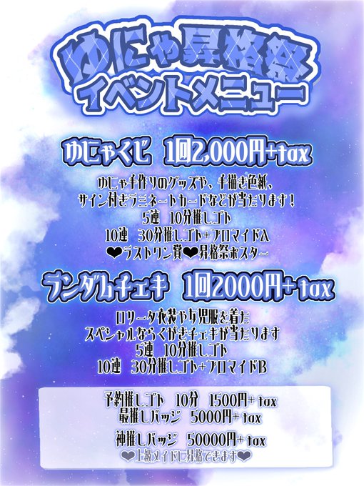 ゆにゃ🍓3/7(土)昇格祭@yunya_monoclub·イベント限定メニューです! どれも数に限りがあるのでお気をつけください!!ゆにゃくじのラインナップは少しずつ公開していこうと思います✨ くじとランダムチェキどっちとも5連、10連で特典あります♡10連だとブロマイドゲットできちゃうのでぜひ狙ってください✊🏻13138