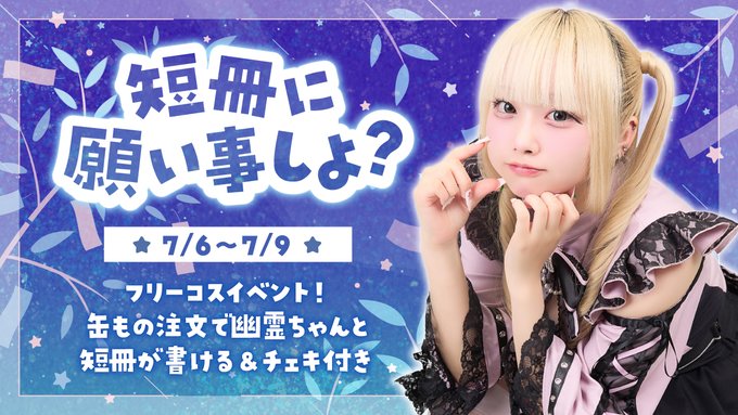 †らゔぃ♡†@reijo_ravi·8時間短冊かけるって〜! 人間様達は何書く〜?引用【秋葉原コンカフェ】幽遊屋敷〜霊女編〜(16:00〜25:00)@uuyashiki_girl·7月2日🎋短冊に願い事しよ?🎋 新霊女初、フリーコスイベント!! いつもとは違う幽霊ちゃんを見に来てください👀 缶物注文で幽霊ちゃんと短冊がかけて、いつもとは違う幽霊ちゃんのチェキがもらえちゃいます!! ・.。 。:* .・゚.゚・. *̣̩・.。 :* .・゚.゚・. *̣̩.。 。:* .・゚.゚・. *̣̩・4