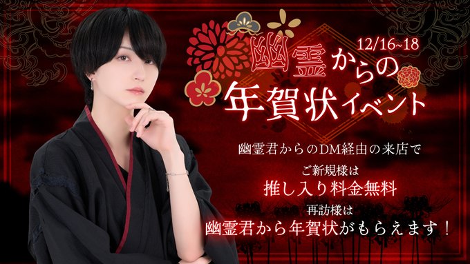 幽遊屋敷∞メンズコンカフェ@uuyashiki_akiba·12月16〜18日のイベントはこちら! 💌🕊~幽霊からの年賀状イベント~🕊💌 幽霊君のDMからご来店頂けたご新規様は!! 推し入りで期間中1セット無料です!✨✨ 再訪様には!!推し入りで【年賀状】が1月届きますよ! #コンカフェ営業 #コンカフェ #コンセプトカフェ #メンコン #メンズコンカフェ47