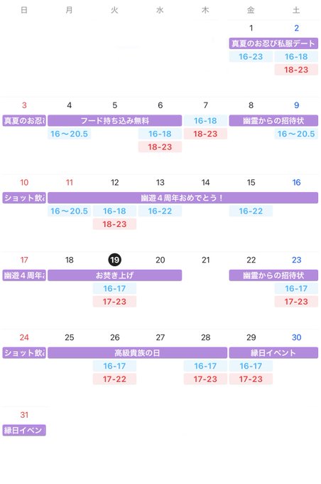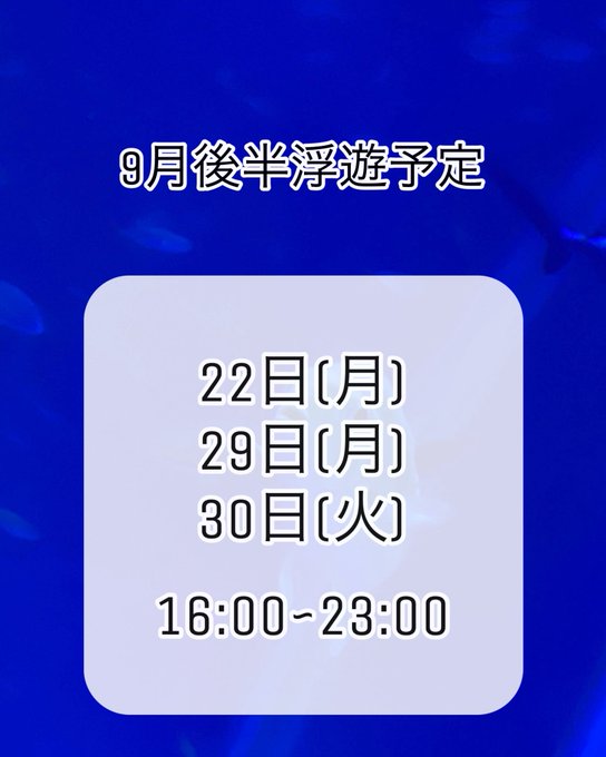 たいよう☀️幽遊屋敷の常夏ニキ@yuyu_taiyou_·浮遊予定が少し変更になりました! 8月の浮遊は… 本日の19日(火) 23日(土) 26日(火) 28日(木) 29日(金) です!ご予定はDMにてお願いします😌 8月もあと半月やけど夏休みの思い出つくろうなぁ〜!1177