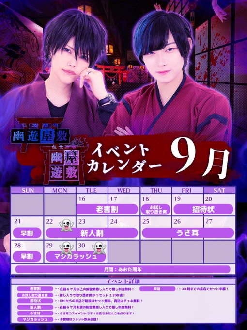 きくり@幽遊屋敷さんがリポスト幽遊屋敷👻男装コンカフェ@uuyashiki_danso·9月8〜10日のイベントはこちら! 👻コネクトチャンス👻 推し幽霊くんと心をひとつに⁉ メンパラの合言葉で1セットとチェキ無料になっちゃいます! 詳しくは画像をチェック✅ 皆様のご来店お待ちしております!🙇♂️🙇♂️541,361